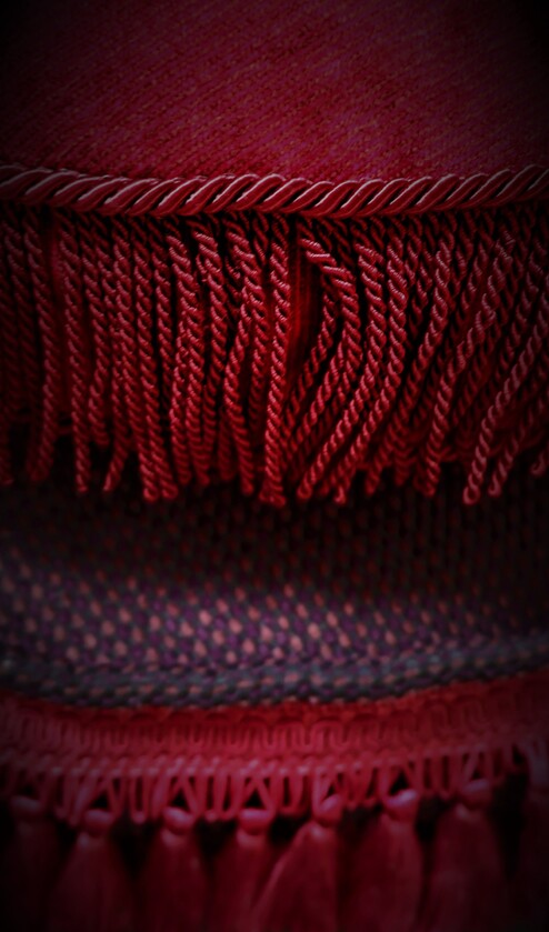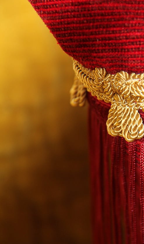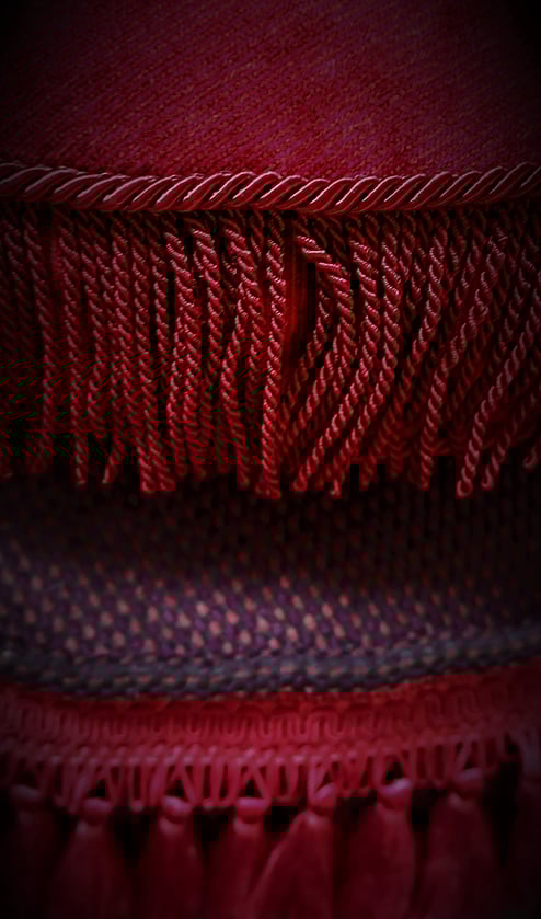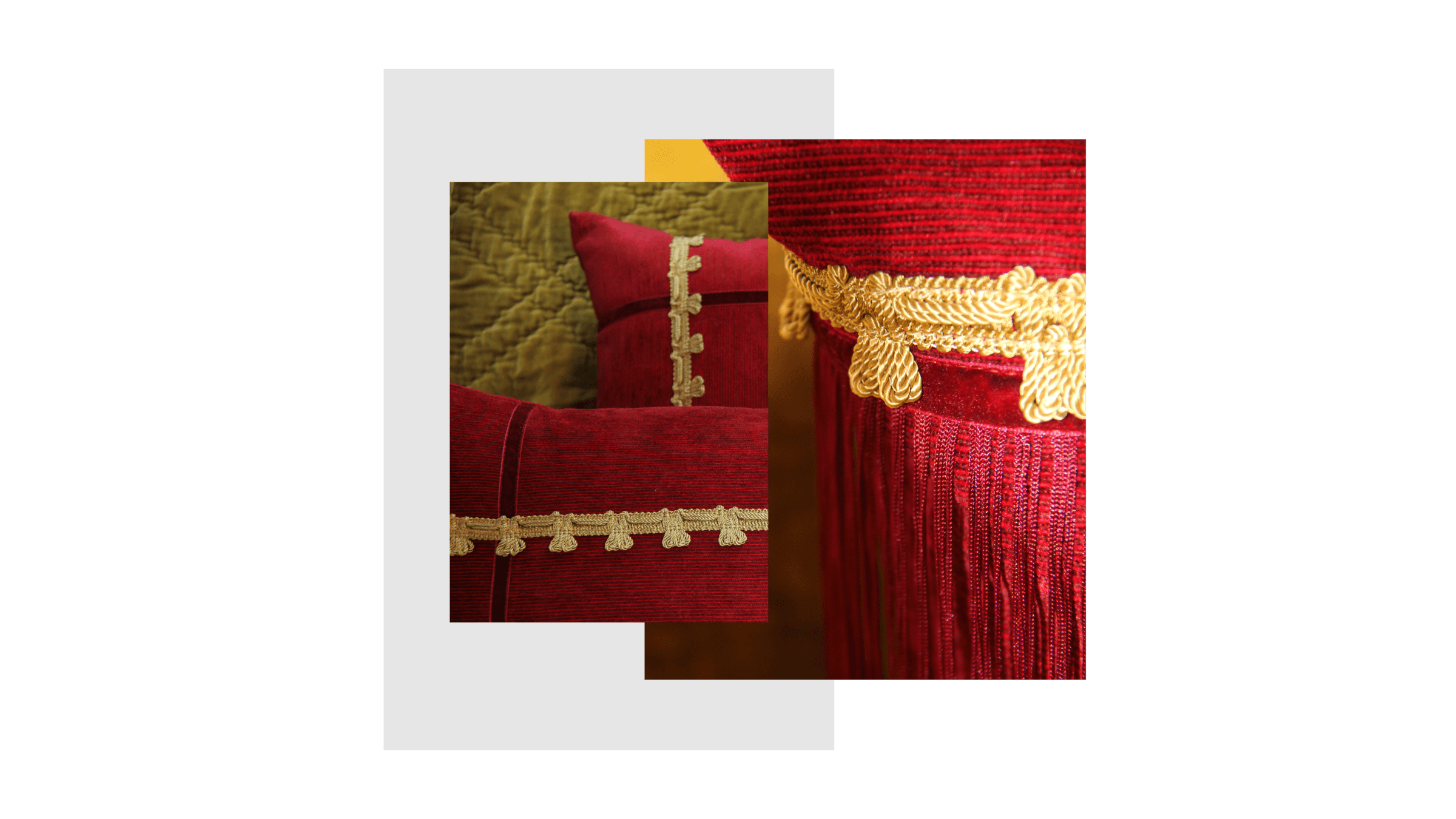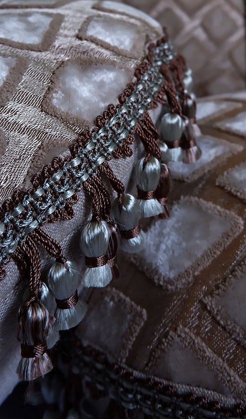 I deliver opulence in my colour palette and textile along with statement placement and arrangement of stunning braids, fringing, ribbons, brooches, and beading.