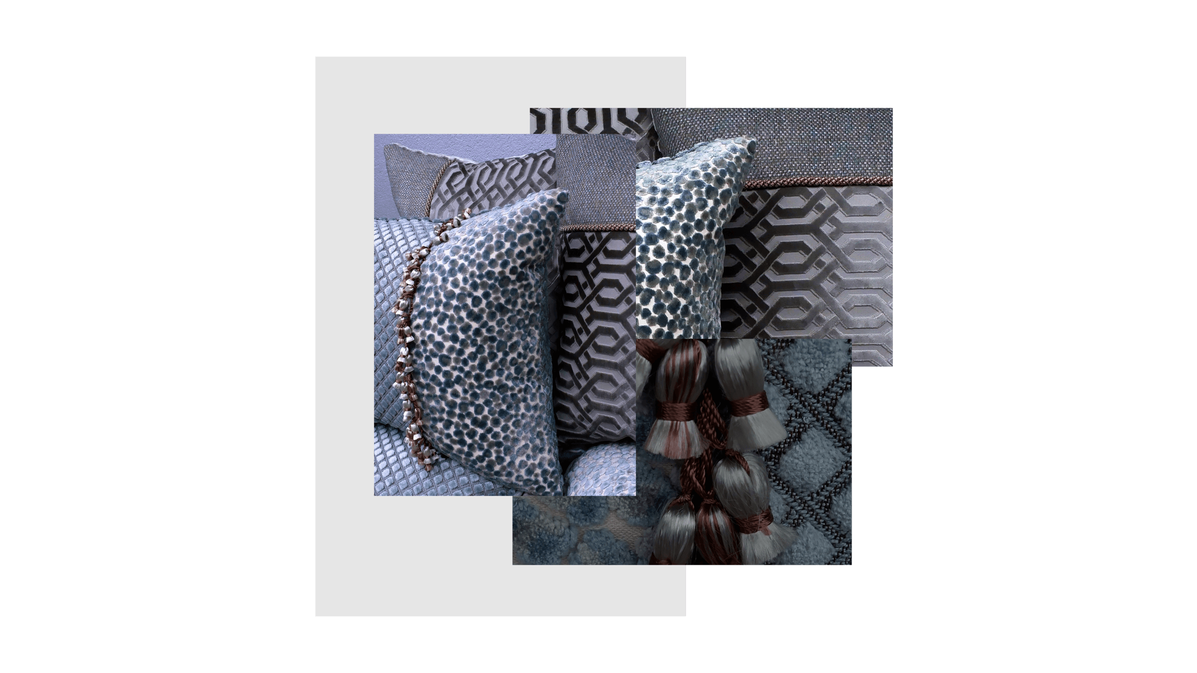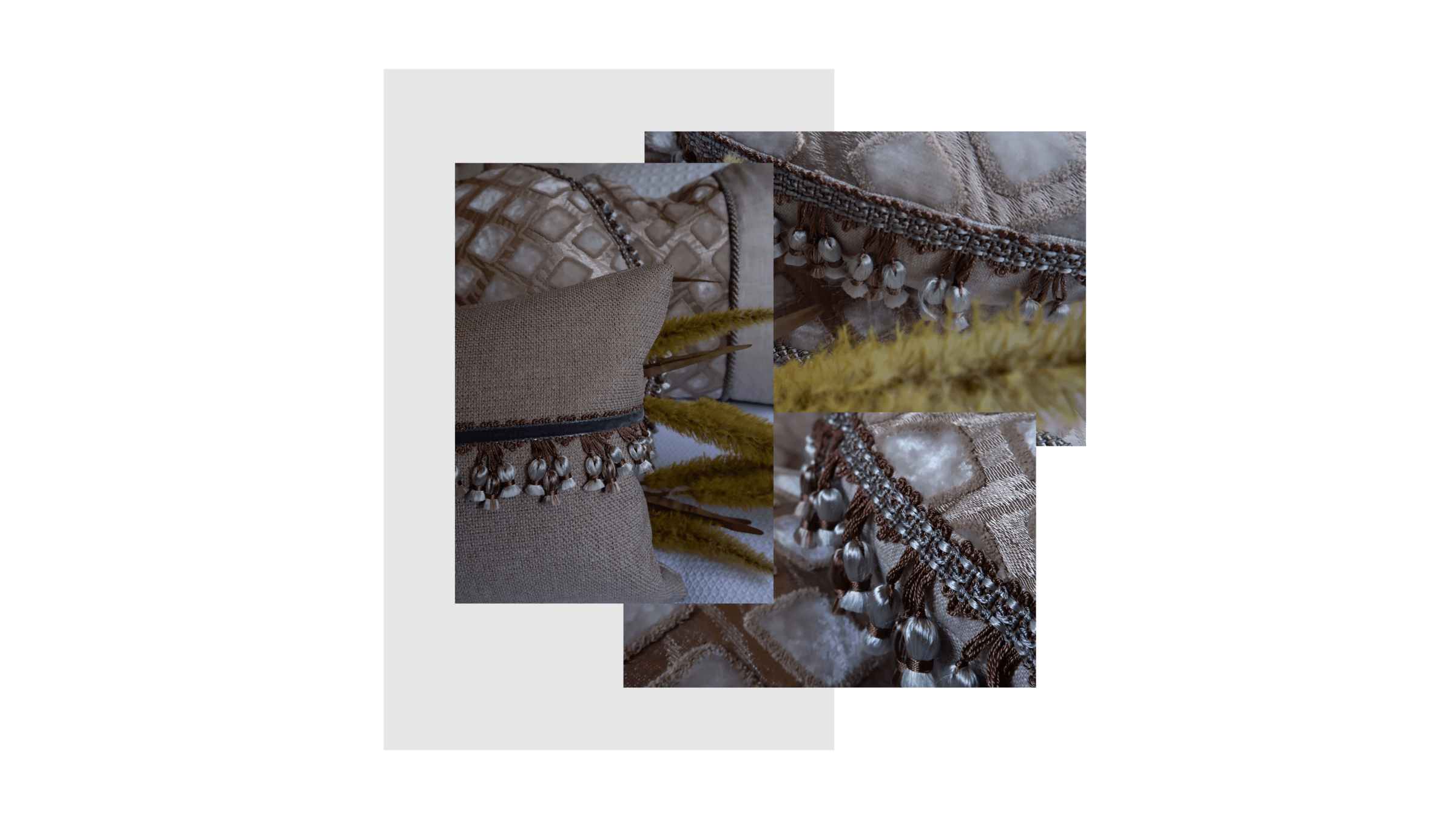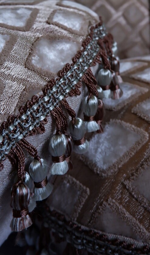 Inspired by sand and shells, the reflection the sun and sea plays in this story is strongly visible though the choice of colour palette and textile. My love of braid, fringing and piping adds some high drama to this stunning Neutral, my smaller playful rounds just top it off!